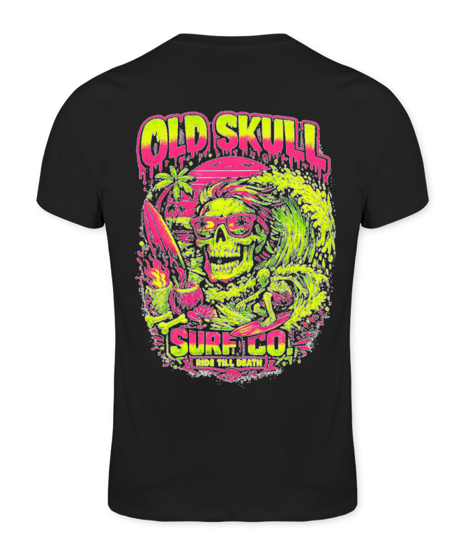 Neon Wave Rider é uma estampa que representa a essência da Old Skull Surf Company: liberdade, atitude e a energia das ondas. Com cores neon vibrantes e um visual ousado, a arte mistura o universo do surf com um estilo irreverente e tropical.